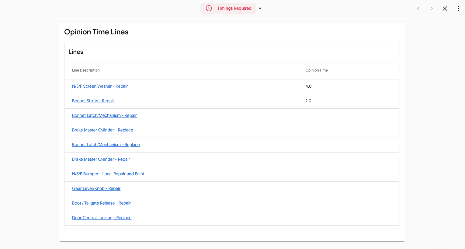 After inspections are complete, if any lines have been added that need an opinion time the WorkEngine will automatically move the vehicle into a status of Timings Required.