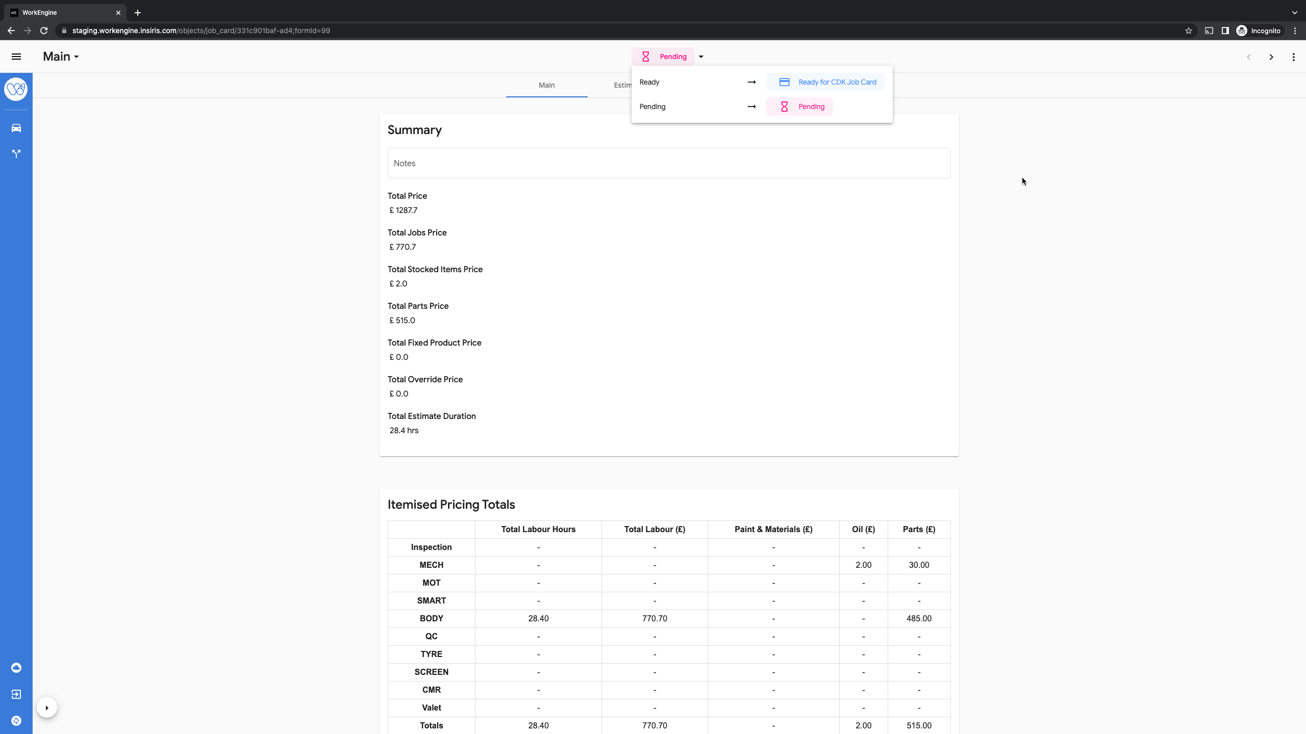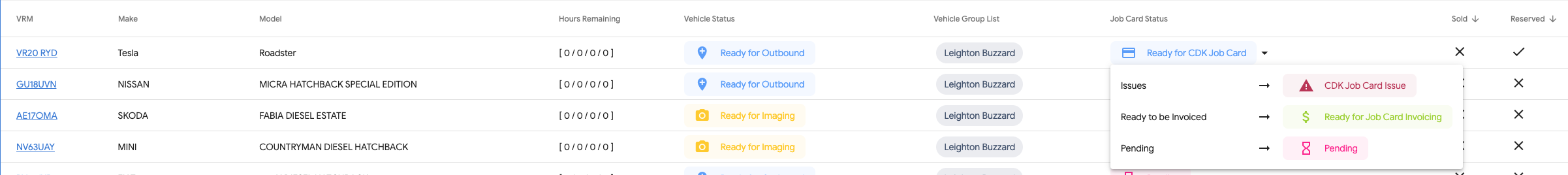 | Job Card Status | Current status of the job card (Pending, Ready for CDK Job Card, Ready for Job Card Invoicing) |
