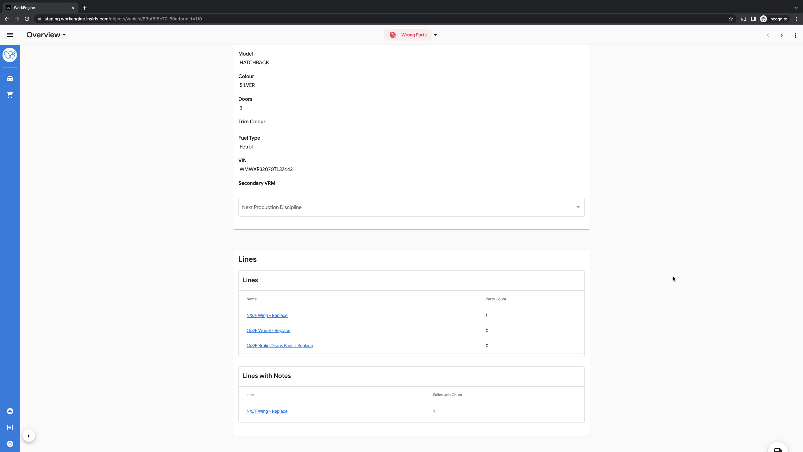 Once you have opened the parts view, this will show you all the information about the vehicle, what lines have been added at inspection and the Parts that have been added. If the part is incorrect, this will be shown in Lines with Notes.