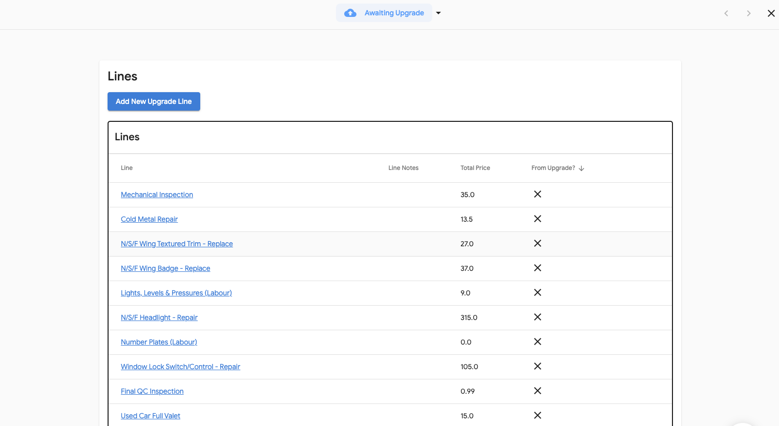 - Including all the lines already added to that vehicle and if they are from Upgrade