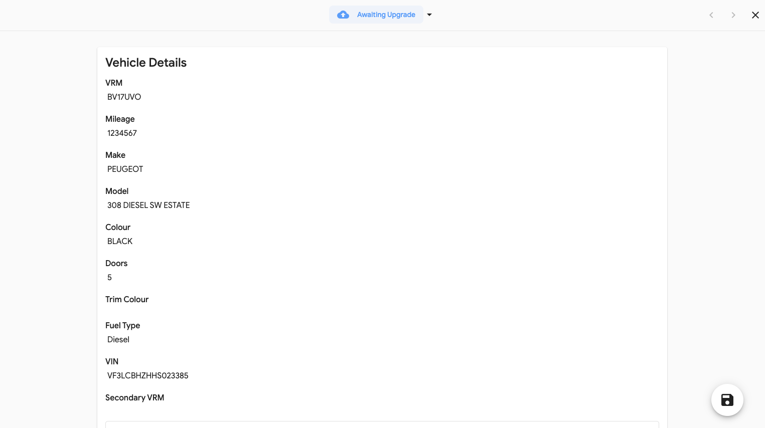 The 'Awaiting Upgrade' form shows all the vehicle details