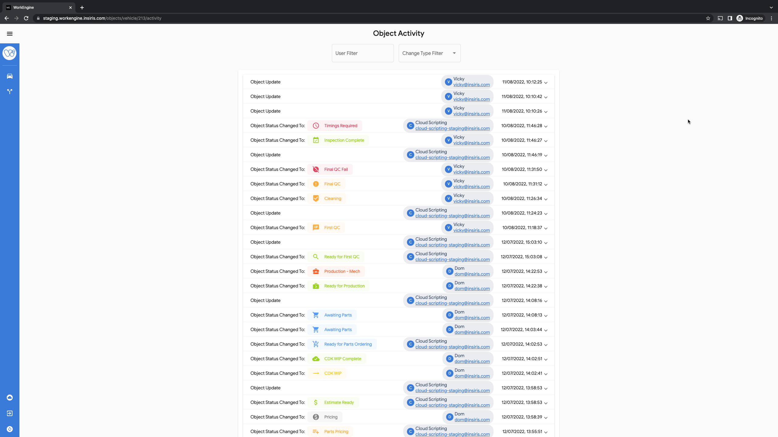Every action within WorkEngine is captured, if you need to see what activity the vehicle has been through or who has moved the vehicle you can see this in the Activity Log.