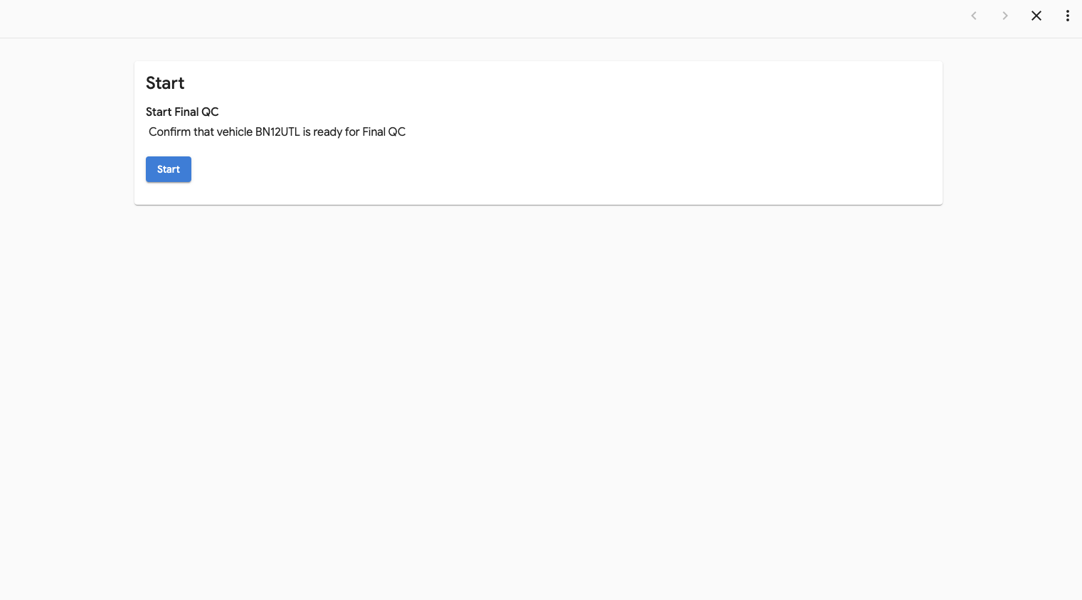 - Confirm that you are working on the correct vehicle and press the Start button. If you have selected the wrong vehicle, select the X in the top right to close the form. This will take you back to the main page and you can start again