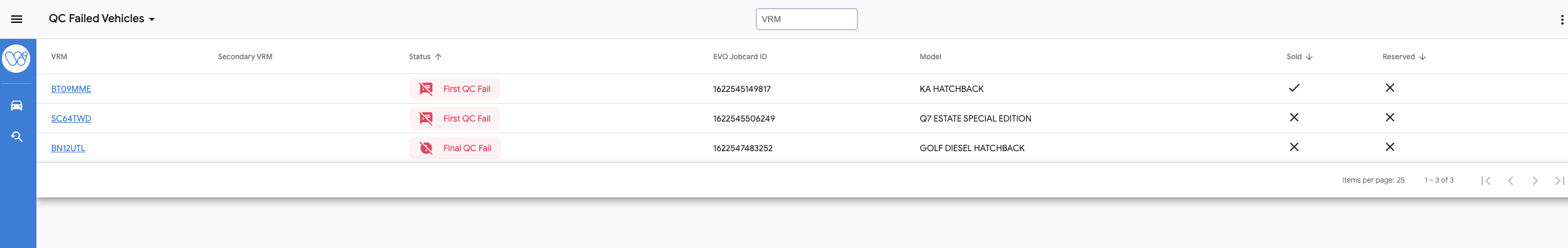 Select QC Failed Vehicles